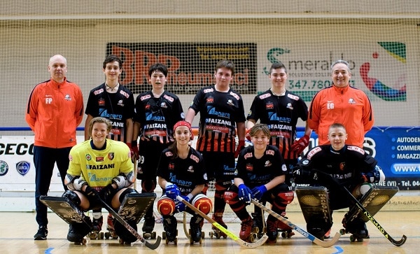 L’Under 13, allenata da Gabriele Thiella, ha conquistato 53 punti in 22 partite, a pari punti col Valdagno, e solo per gli scontri diretti non si è qualificata per le finali scudetto a conferma della crescita sicuramente incoraggiante di un gruppo di ragazzi appassionati alle loro prime finali. Inserita nel girone B con Molfetta e CGC Viareggio sulla pista del Pala Molza a Modena, è squadra seguita con affetto e simpatia da tutta la società rossonera. Questa la formazione: portieri Giulio Battistin e Thomas Pavone, esterni Tommaso Volpe, Tommaso Battaglin, Gianni Carraro, Cristian Costenaro, Ettore Barbieri, Filippo Montini, Luca Gasparotto e Davide Graziani. Nello staff: l’allenatore Federico Cortese, dirigenti accompagnatori il vice presidente Stefano Volpe e Davide Battaglin