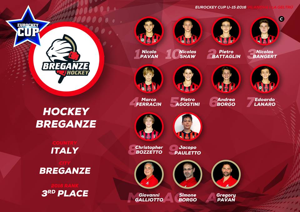 Il terzo posto conquistato alle finali scudetto di Follonica 2016 ha qualificato l’Under 15 breganzese, allenata da Gianni Galliotto, con i dirigenti accompagnatori Simone Borgo e Gregory Pavan, a partecipare all’Eurockey in programma a Vilanova i la Geltru’ (Catalunya, Spagna) da venerdì 28 a domenica 30 ottobre.