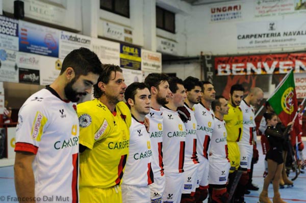 “Prima di tutto voglio ringraziare tutta la città che ha risposto veramente alla grande a questo evento che ci ha catapultato nella vetrina europea poi voglio ringraziare Ivan Vatteroni e tutta la Curva Milani eccezionali che per tutta la gara non hanno mai smesso di incitare i nostri ragazzi – commenta il presidente Maurizio Corona a fine partita “E’ stata una serata di gala per la nostra società, ma credo che abbiamo dato lustro a tutta la nostra città. Mi ha fatto molto piacere premiare Silvia Lambruschi, Vice Campionessa del Mondo di Pattinaggio Artistico la scorsa settimana a Reus, un’eccellenza sportiva della nostra terra, una ragazza semplice e solare, molto legata alla nostra società e con lei Alessandro Amadesi Campione del Mondo a Reus, bolognese ma oramai spezzino d’adozione. Guardando invece la partita abbiamo giocato contro un’ottima squadra – continua Corona – e poi il quintetto allenato da Punset può avvalersi di un giocatore del calibro di Toni Sero autentico tuttofare uomo d’ordine e goleador della squadra transalpina. Comunque penso –conclude il Presidente – che il Carispezia di questa sera abbia espresso il 50% delle proprie potenzialità e tra due settimane andremo in Francia per provare a ribaltare il risultato. Gli fa eco proprio Alessandro Cupisti che parla della partita di ritorno: “non abbiamo fatto una grande prova eravamo tesi e con una mentalità abbastanza lontana da quella che serve in campo europeo, ma io conosco i miei ragazzi e so quello che valgono sono certo che abbiamo tantissime possibilità di passare il turno, anzi ne sono quasi certo. La partita di ritorno sarà tutta un’altra storia. Ma veniamo alla gara Sergi Punset, che arriva al Centro Polivalente con l’organico al gran completo, schiera il suo starting-five titolare con David insieme a Guilbert e alla coppia d’attacco spagnola formata dal capocannoniere del Campionato Francese della scorsa stagione Toni Sero e Teixido con Audelin portiere della nazionale Francese alla difesa della porta e a disposizione Le Roux , Minuzzi, Garcia e il secondo portiere Savreux. Cupisti risponde con Corona tra i pali, Sterpini, Squeo, Borsi e Dolce. Per la cronaca partita subito in salita per i rossoneri che dopo 55” subiscono il vantaggio transalpino, grazie a una bellissima combinazione di contropiede con Guilber che confeziona un preciso assist a Sero che trasforma in rete. Squadra rossonera un pochino contratta nei minuti iniziali, poi mister Cupisti inserisce Di Donato che risulterà il migliore dei rossoneri, il giovane difensore sarzanese porta ritmo alla manovra e la squadra prende fiducia nei propri mezzi e all’ 11’ trova la rete del pareggio, un perfetto affondo di Borsi che confeziona un preciso suggerimento a Squeo che di prima intenzione spedisce la palla alle spalle di Audelin. Trovato il pareggio il Carispezia esprime il miglior gioco e le occasioni fioccano. Prima Pistelli, a tu per tu con il portiere francese, poi Borsi ed ancora Squeo vanno vicinissimi al vantaggio. Quando il primo tempo sembra oramai indirizzato a concludersi con il risultato di parità, arriva il rigore, per fallo da terra di Le Roux che toglie la pallina dalla mazza di Borsi. E’ lo stesso giocatore rossonero a portarsi sul dischetto e battere Audelin con una conclusione a mezza altezza sulla sinistra del portiere francese che fissa il parziale del primo tempo sul 2 a 1 a favore dei Sarzanesi, punteggio con cui le squadre vanno al riposo. Nel secondo tempo il Saint Omer cerca subito di recuperare la gara con azioni in velocità quasi sempre finalizzate per l’ ottimo Sero. Al 29’, 51 rigore per la formazione francese, si incarica della battuta Sero che trova la ribattuta di Corona, l’attaccante spagnolo è bravissimo a stoppare la ribattuta del portiere sarzanese e trafiggere il portiere del Carispezia. Lo stesso attaccante al 32’,52” con una magia , nasconde la pallina e poi la deposita in rete per il vantaggio del Saint Omer. Al 36’,30” Borsi si trova sulla mazza la possibilità di pareggiare grazie a un rigore decretato dagli arbitri per un fallo evidente in area di Garcia, ma in questa occasione Audelin si esalta e para. Dopo dieci secondi decimo fallo della squadra di Alessandro Cupisti e tiro di prima per la formazione di Sergi Punset, alla battuta si presenta il solito Sero ma Corona è bravissimo ad intercettare la conclusione. Il Carispezia riprende coraggio e al 38’,09” Sterpini lascia partire una conclusione dalla distanza che sorprende Audelin. Non passano neppure due minuti che la difesa rossonera pasticcia e l’ex fortemarmino Cirillo Garcia può spingere la palla in rete da pochi centimetri. Ancora un rigore per il Carispezia ancora Borsi alla battuta che in questa occasione è sfortunato e la traversa interna rimanda in pista la pallina con l’aiuto dell’ ottimo Audelin. Cupisti prova la carta Vargas che si fa applaudire per alcune giocate, anche se il bomber argentino non sembra ancora a proprio agio sul pavimento del Vecchio Mercato. “Occasionissima” per il Saint Omer per chiudere la sfida d’andata sul doppio vantaggio, Leonardo Squeo a 15 secondi dal termine, viene punito con un cartellino blu per un fallo su Teixido ancora Sero contro Corona che si esalta e para ancora, portando i rossoneri tra quindici giorni a Saint Omer con un solo goal di svantaggio e la possibilità ancora di ribaltare il risultato e conquistare la qualificazione al secondo turno. Ora doppio turno casalingo di Campionato Martedì 21 Ottobre il Trissino e Sabato 25 il Follonica al Vecchio Mercato.