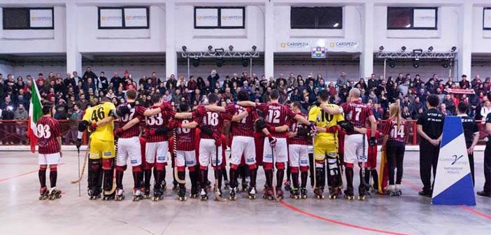 Il Carispezia Sarzana vola a Lisbona per sfidare nella gara di ritorno lo Sporting Lisbona nei quarti di finale di Coppa CERS. È certamente un appuntamento con la storia quello della formazione rossonera, nonostante la perentoria sconfitta subita a Sarzana nella partita d’andata che ha di fatto compromesso la possibilità di conquistare la final-four di Coppa Cers. La formazione Sarzanese che sarà seguita in trasferta dal giornalista della Nazione Gianni Bertocchi e dal Senatore Massimo Caleo sarà ricevuta nella mattinata di sabato dal Console italiano a Lisbona. La partita si giocherà alle ore 16,00 locali, ore 17,00 italiane e sarà trasmessa in diretta streaming su Cerh tv, collegamento diretto dal sito di Hockey Pista (nella foto l’emozionante coreografia della gara d’andata).