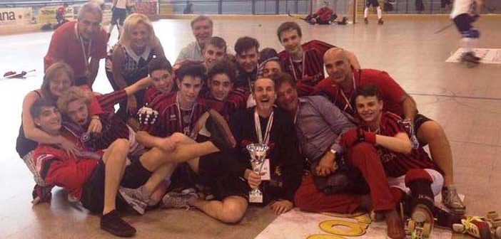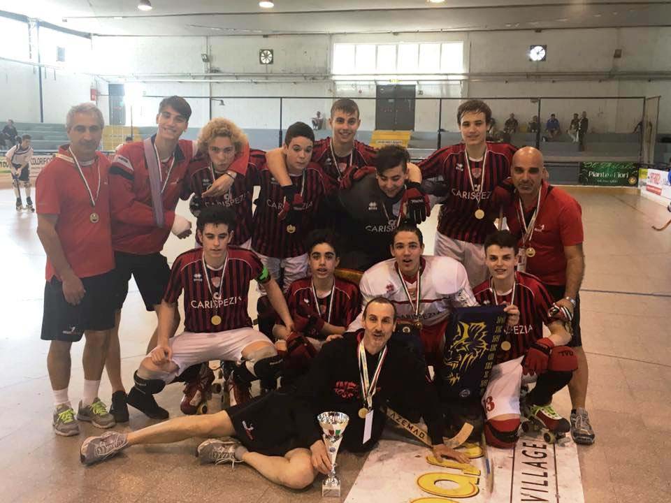 Carispezia Hockey Sarzana batte con secco 4 a 1 in finale l’ Hockey Forte dei Marmi e conquista la Coppa Italia Under 17 stagione 2015-2016. Per la società di Piazza Terzi è la settima Coppa Italia conquistata della sua storia, la seconda nella Categoria Under 17. Dopo l’esordio vincente contro l’ Hockey Club La Mela bissato dal successo contro l’ Hockey Breganze nel girone eliminatorio. I rossoneri si sono complicati la vita in semifinale contro il Thiene dove in vantaggio per 3 a 0 si sono fatti raggiungere sul pari e hanno avuto la meglio dei veneti solo dopo i tiri di rigore. Nella finalissima il Carispezia non ha avuto nessun problema contro il Forte dei Marmi dove solo le ottime parate di Bertozzi hanno fatto si che lo scarto non fosse abissale tra le due squadre. Carispezia che ha dovuto rinunciare dopo la prima partita a un elemento determinante come Matteo Tavoni rottura del polso per lui, ed è diventato determinante l’utilizzo di Alessandro Ungari categoria under 15. Il Presidente Corona dichiara “Avrei tantissimi sassolini da togliermi dalle scarpe, con chi ci ha criticato gratuitamente durante la stagione, abbiamo vinto, ma che avremmo vinto questa coppa ne ero certo già prima di partire di Follonica. Questa vittoria è di Fabrizio Bassani che con questo successo è l’allenatore più vincente della nostra storia e di tutto il nostro staff tecnico, uno staff tecnico di prim’ordine. Sono veramente felice – conclude Corona – dopo la delusione della mancata qualificazione alle finali di campionato, alzare la coppa era l’ obiettivo primario della società e lo abbiamo conquistato, non posso che dire grazie ai miei ragazzi” (nella foto la formazione dopo la premiazione).